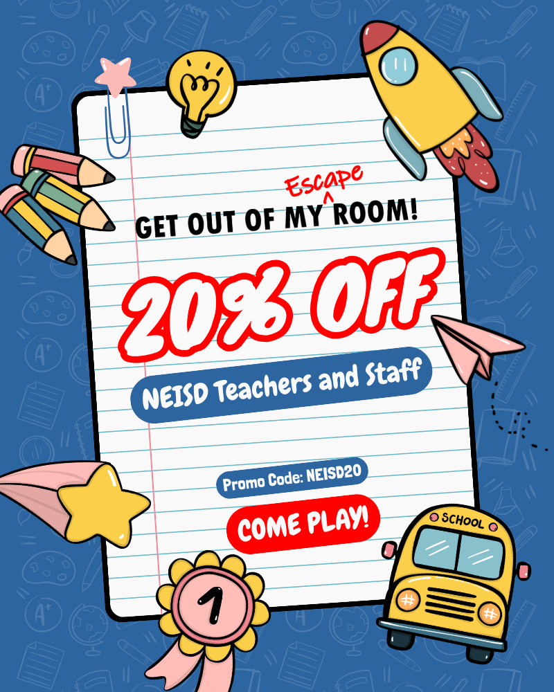Looking for a fun team outing or family challenge 🗝️? NEISD teachers and staff can enjoy 20% off an unforgettable experience at Get Out of My Escape Room—just use code NEISD20 when booking and start your adventure! 🔐🧩✨